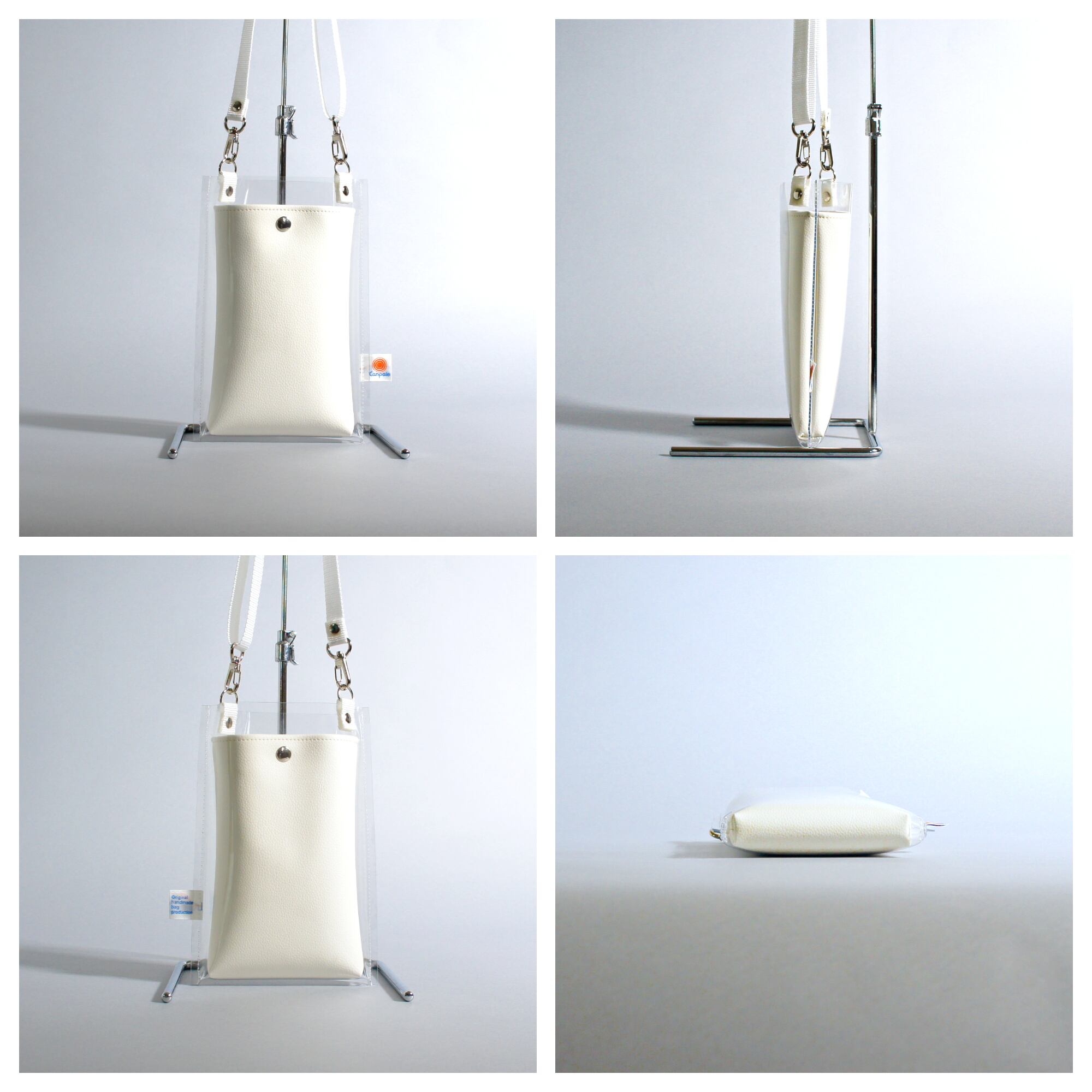 ストラップは、ホワイトのPPテープで、カジュアルな軽快さが感じられます。
