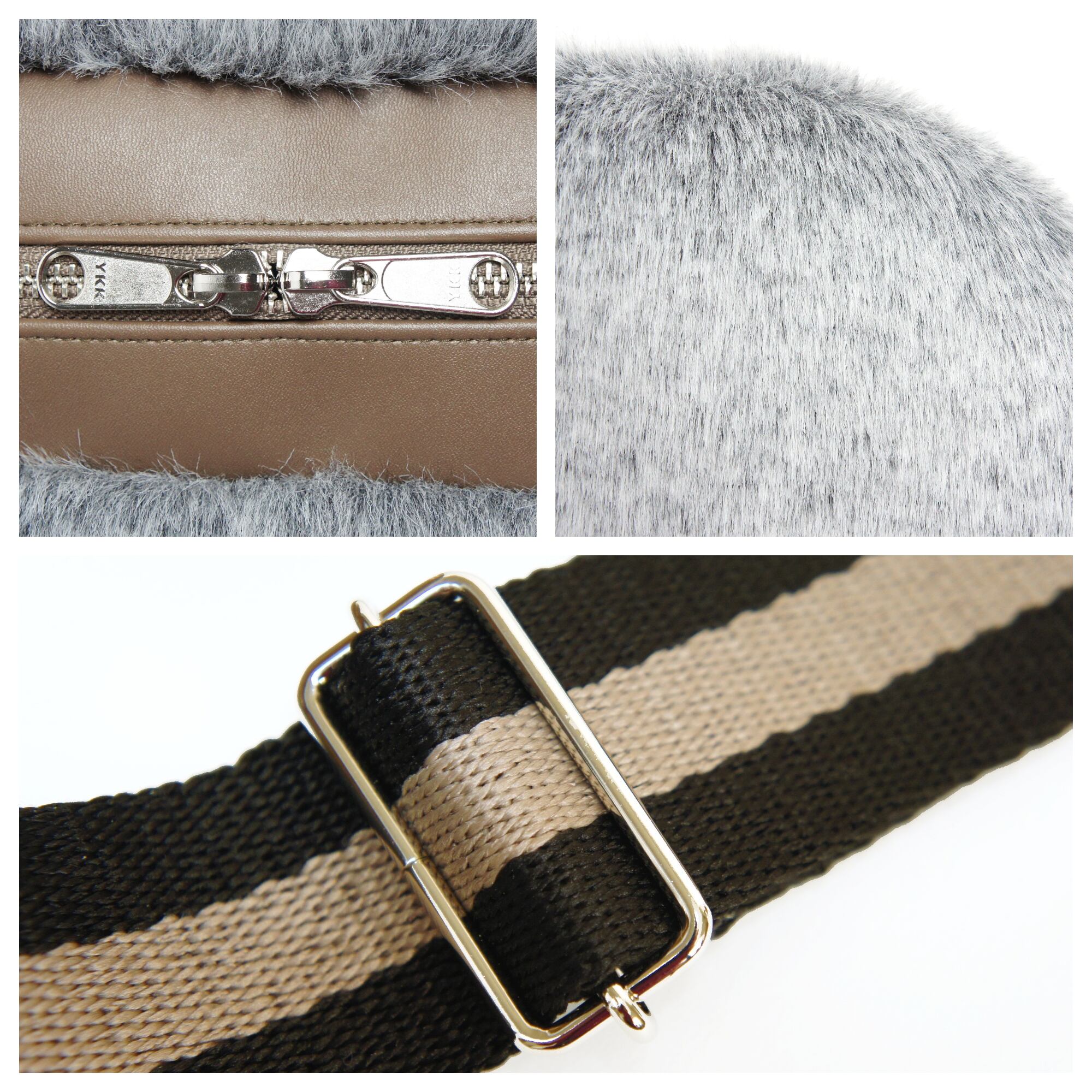 ふわふわもこもこのフェイクファーとブラウンのPUレザー(エコレザー)の組み合わせで、大人なかわいらしさがあるバッグになりました。